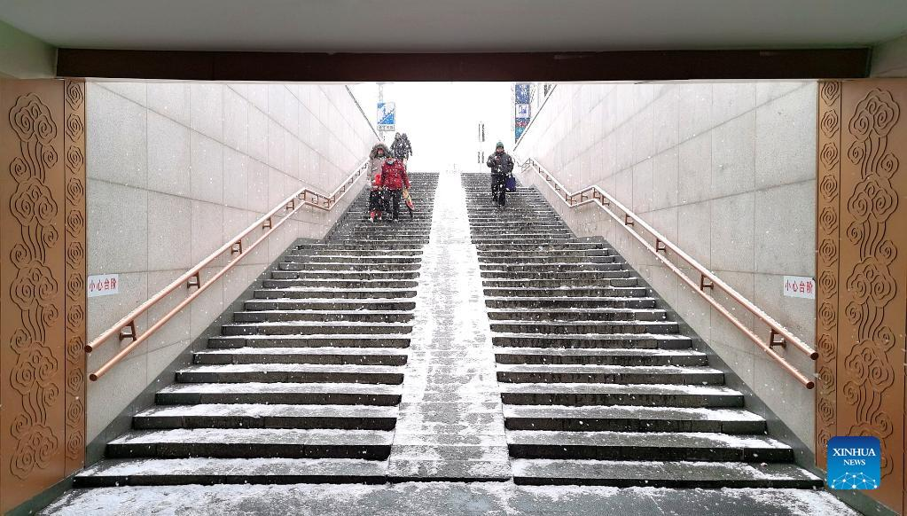 Photo taken on Jan. 20, 2022 with a mobile phone shows citizens walking amid snowfall in Beijing, capital of China. (Xinhua/Ding Hongfa)