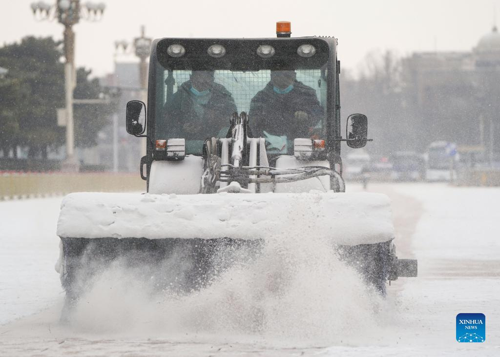 Sanitation workers clear snow at the Tian'anmen Square in Beijing, capital of China, Jan. 20, 2022. (Xinhua/Chen Yehua)