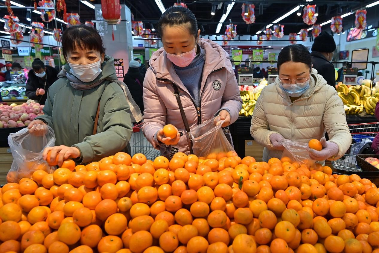 Consumers select fruits at a supermarket in Qingzhou city, east China’s Shandong province, Jan. 12, 2022. (People’s Daily Online/Wang Jilin)