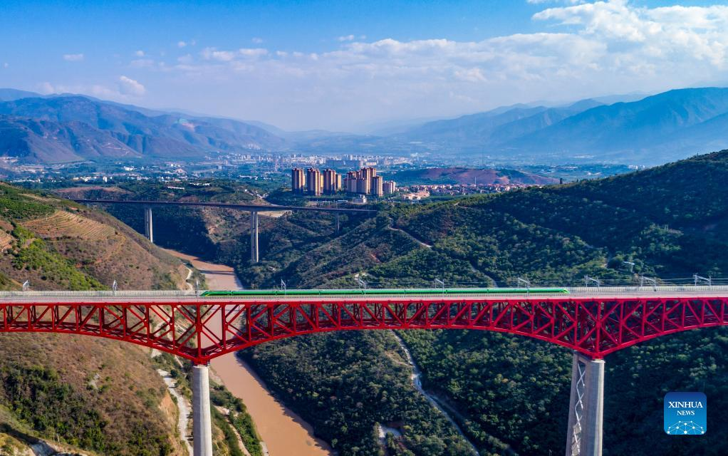 Aerial photo shows a train crossing the Yuanjiang major bridge over the Yuanjiang River in southwest China's Yunnan Province, Jan. 18, 2022. Shi Pengbin, 28, is a technician responsible for maintaining the Yuanjiang major bridge, a key bridge of the China-Laos Railway project. Spanning a full length of 832.2 meters, the Yuanjiang bridge uses six bridge piers with the No.3 bridge pier, the highest pier, standing at 154 meters. Shi, who started working for the construction of the China-Laos Railway from April 2020, even postponed his wedding to guarantee on-time completion of the bridge. After the operation of China-Laos Railway, Shi's work includes checking the bridge in high places during the day, and repairing the bridge floor during the break time for rail service at night. During this year's Spring Festival holiday, Shi and his colleagues will stick to their posts to secure the railway transportation. (Xinhua/Chen Xinbo)