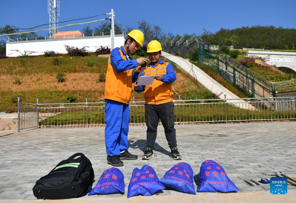 Shi Pengbin (L) explains to his colleague about maintaining the Yuanjiang major bridge over the Yuanjiang River in southwest China's Yunnan Province, Jan. 18, 2022. Shi Pengbin, 28, is a technician responsible for maintaining the Yuanjiang major bridge, a key bridge of the China-Laos Railway project. Spanning a full length of 832.2 meters, the Yuanjiang bridge uses six bridge piers with the No.3 bridge pier, the highest pier, standing at 154 meters. Shi, who started working for the construction of the China-Laos Railway from April 2020, even postponed his wedding to guarantee on-time completion of the bridge. After the operation of China-Laos Railway, Shi's work includes checking the bridge in high places during the day, and repairing the bridge floor during the break time for rail service at night. During this year's Spring Festival holiday, Shi and his colleagues will stick to their posts to secure the railway transportation. (Xinhua/Chen Xinbo)