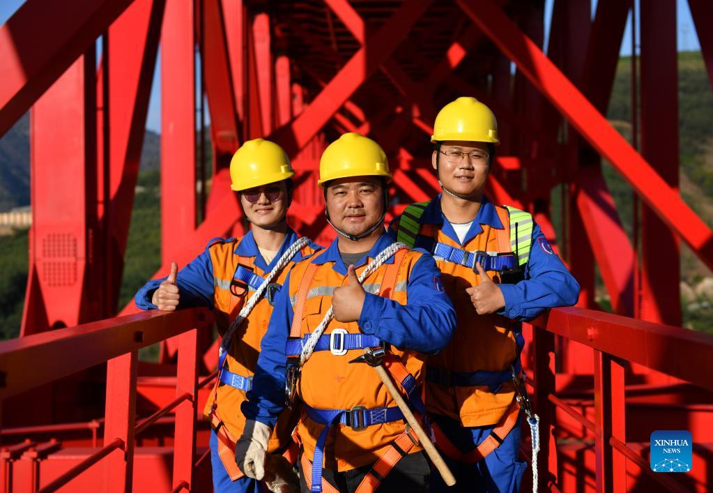 Shi Pengbin (C), poses for a photo with his colleagues on the Yuanjiang major bridge over the Yuanjiang River in southwest China's Yunnan Province, Jan. 18, 2022. Shi Pengbin, 28, is a technician responsible for maintaining the Yuanjiang major bridge, a key bridge of the China-Laos Railway project. Spanning a full length of 832.2 meters, the Yuanjiang bridge uses six bridge piers with the No.3 bridge pier, the highest pier, standing at 154 meters. Shi, who started working for the construction of the China-Laos Railway from April 2020, even postponed his wedding to guarantee on-time completion of the bridge. After the operation of China-Laos Railway, Shi's work includes checking the bridge in high places during the day, and repairing the bridge floor during the break time for rail service at night. During this year's Spring Festival holiday, Shi and his colleagues will stick to their posts to secure the railway transportation. (Xinhua/Chen Xinbo)