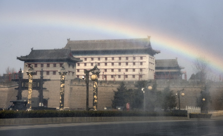 A rainbow appears in the water mist of a sprinkler near Yongning Gate in Xi'an, northwest China's Shaanxi Province, Jan. 19, 2022. (Xinhua/Tao Ming)