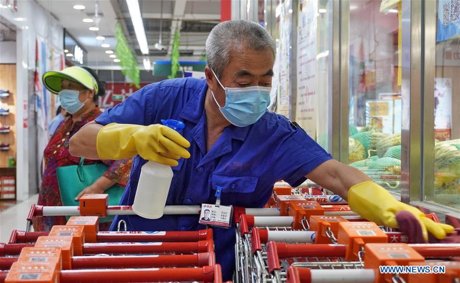A staff member conducts disinfection work at a supermarket in Fengtai District of Beijing, capital of China, June 15, 2020. (Xinhua/Li Xin)