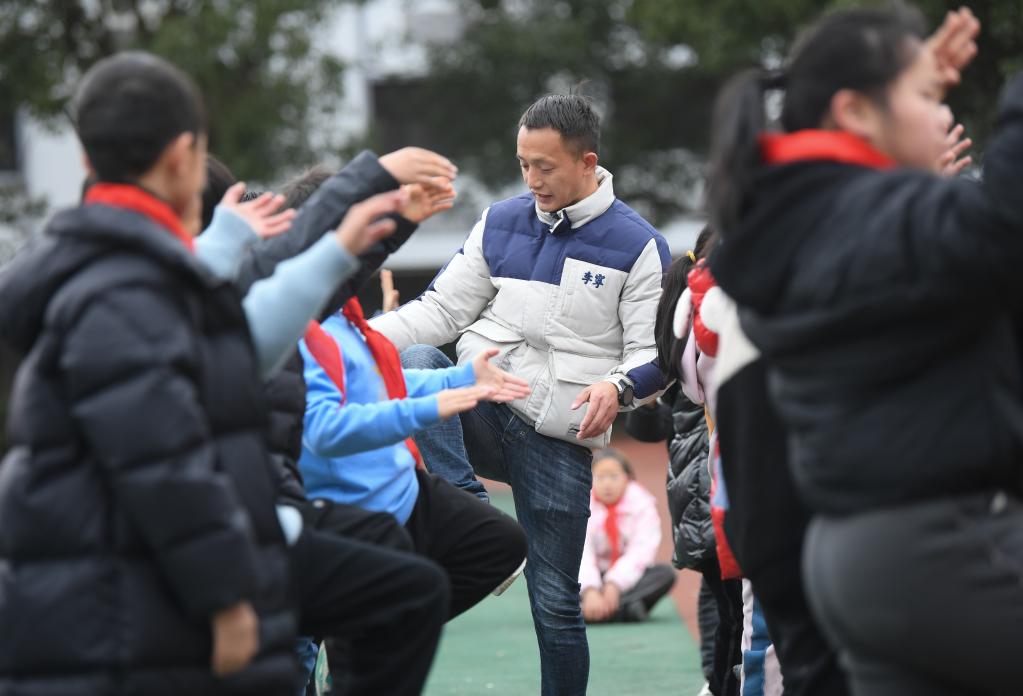 Tong Panfeng instructs students basic movements of lion dance at a primary school of Qiantong ancient town in Ninghai County, east China's Zhejiang Province, Jan. 21, 2022. Tong Panfeng is an enthusiast of lion dance. At the age of 26, he quit his job to learn lion dance all over the country. In 2016, with the support of the local government, Tong returned to his hometown to promote the lion dance into school activities with an aim to help primary and middle school students keep fit and inherit the traditional culture. Thanks to the efforts of Tong, many local primary and middle school students joined the lion dance team of the town and they often practice lion dance in their spare time. In recent years, this team has achieved good results in provincial and national championships for many times.Lion dance is not only a sport but also a cultural tradition which has made the the ancient town full of vitality. (Xinhua/Weng Xinyang)