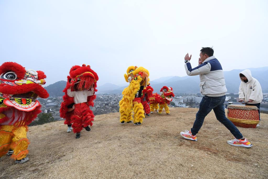 Tong Panfeng instructs members of a lion dance team during a training near Qiantong ancient town in Ninghai County, east China's Zhejiang Province, Jan. 20, 2022. Tong Panfeng is an enthusiast of lion dance. At the age of 26, he quit his job to learn lion dance all over the country. In 2016, with the support of the local government, Tong returned to his hometown to promote the lion dance into school activities with an aim to help primary and middle school students keep fit and inherit the traditional culture. Thanks to the efforts of Tong, many local primary and middle school students joined the lion dance team of the town and they often practice lion dance in their spare time. In recent years, this team has achieved good results in provincial and national championships for many times.Lion dance is not only a sport but also a cultural tradition which has made the the ancient town full of vitality. (Xinhua/Weng Xinyang)