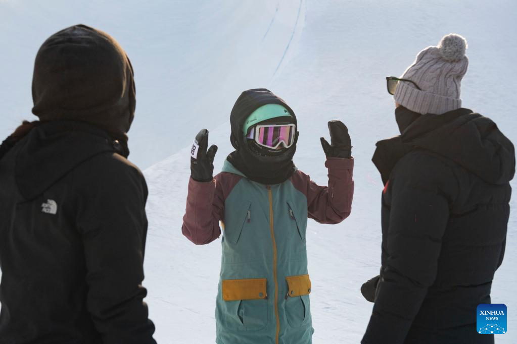 A skier (C) talks to coach (R) during training at Yabuli Ski Resort, in Harbin, northeast China's Heilongjiang Province, Jan. 21, 2022. Yabuli, located in northeastern China, is the cradle of Chinese winter sports. Boasting a professional ski area, Yabuli Resort hosted many national, continental and international winter games like FIS snowboard world cup, World Winter Universiade and the Asian Winter Games. (Xinhua/Xie Jianfei)