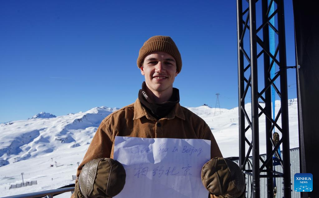 Switzarland's snowboarder Jan Scherrer poses with a piece of paper writing "See You in Beijing", in Laax, Switzerland, on Jan. 14, 2022. With less than two weeks to go before the start of the 2022 Winter Olympics in Beijing, people around the world are eagerly expressing their joy over the sporting extravaganza. (Xinhua/Xiao Yazhuo)