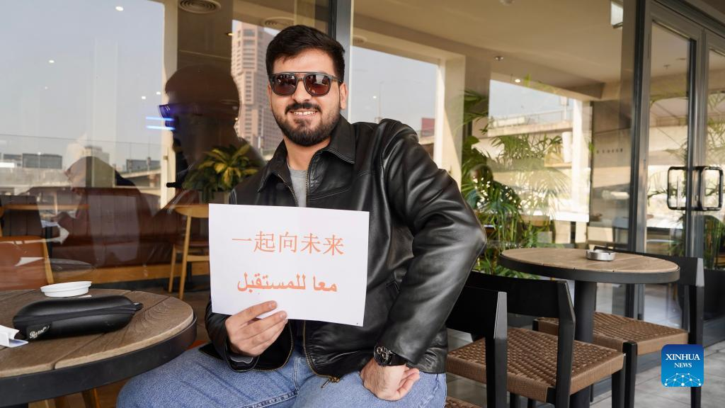 Ahmed, a university student majoring in medicine, poses with a piece of paper printing "Together for a Shared Future", the official motto for Beijing 2022, in Cairo, Egypt, on Jan. 18, 2022. With less than two weeks to go before the start of the 2022 Winter Olympics in Beijing, people around the world are eagerly expressing their joy over the sporting extravaganza. (Xinhua/Wang Dongzhen)