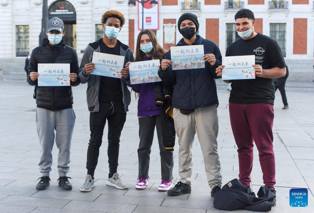 A group of young people pose with "Together for a Shared Future", the official motto for Beijing 2022, in Madrid, Spain, on Jan. 18, 2022. With less than two weeks to go before the start of the 2022 Winter Olympics in Beijing, people around the world are eagerly expressing their joy over the sporting extravaganza. (Xinhua/Meng Dingbo)