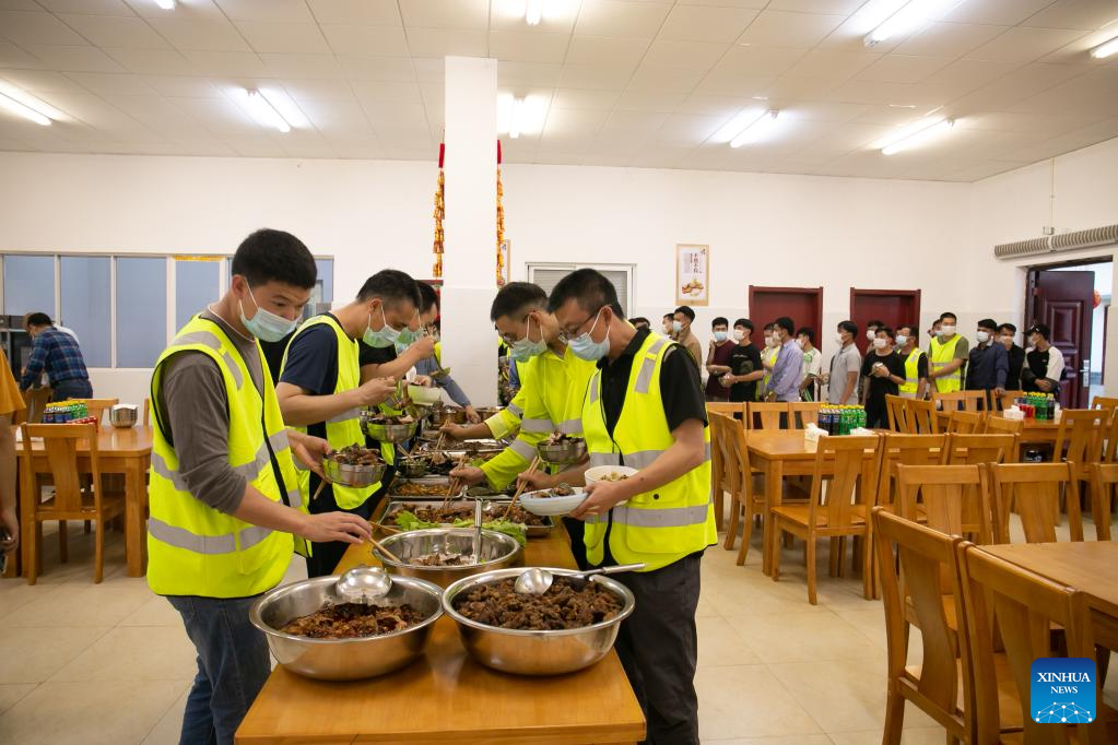 Staff members of the China-Laos Railway Luang Prabang Operation Management Center have dinner at the center in Luang Prabang, Laos, Jan. 22, 2022. China-Laos Railway Luang Prabang Operation Management Center, run by China Railway Kunming Group, held celebration activities on Sunday for the upcoming Chinese Lunar New Year. (Photo by Kaikeo Saiyasane/Xinhua)