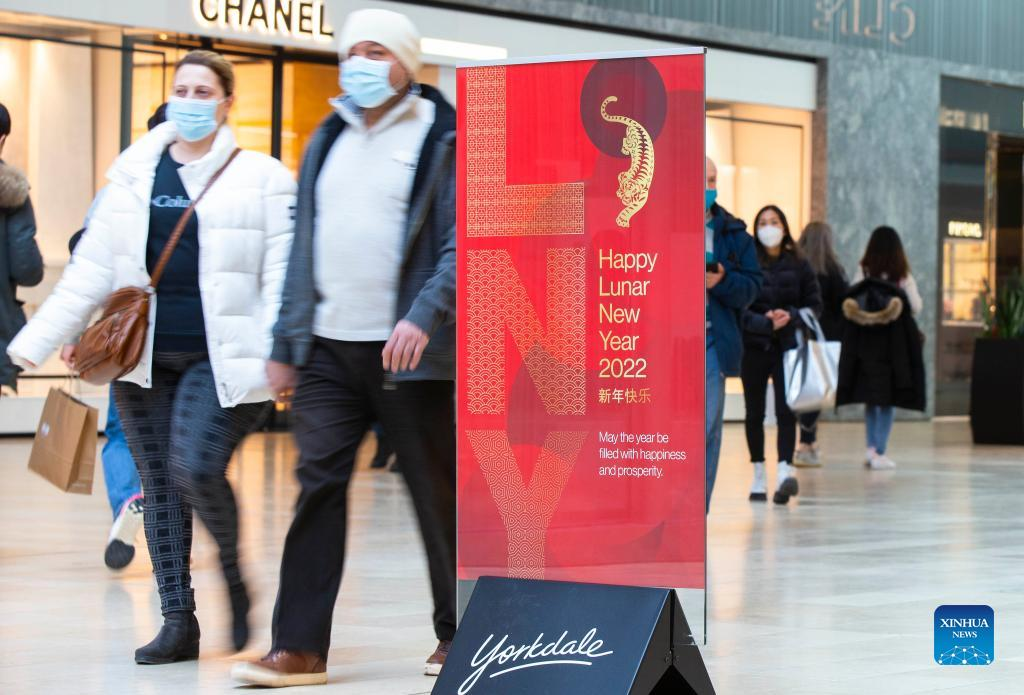 People wearing face masks walk past a poster marking the upcoming Chinese Lunar New Year at a shopping center in Toronto, Canada, on Jan. 22, 2022. (Photo by Zou Zheng/Xinhua)