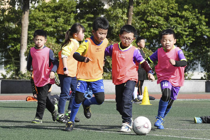 Pupils play football during winter vacation in Renhuai City, southwest China's Guizhou Province, Jan. 18, 2022. (Photo by Chen Yong/Xinhua)