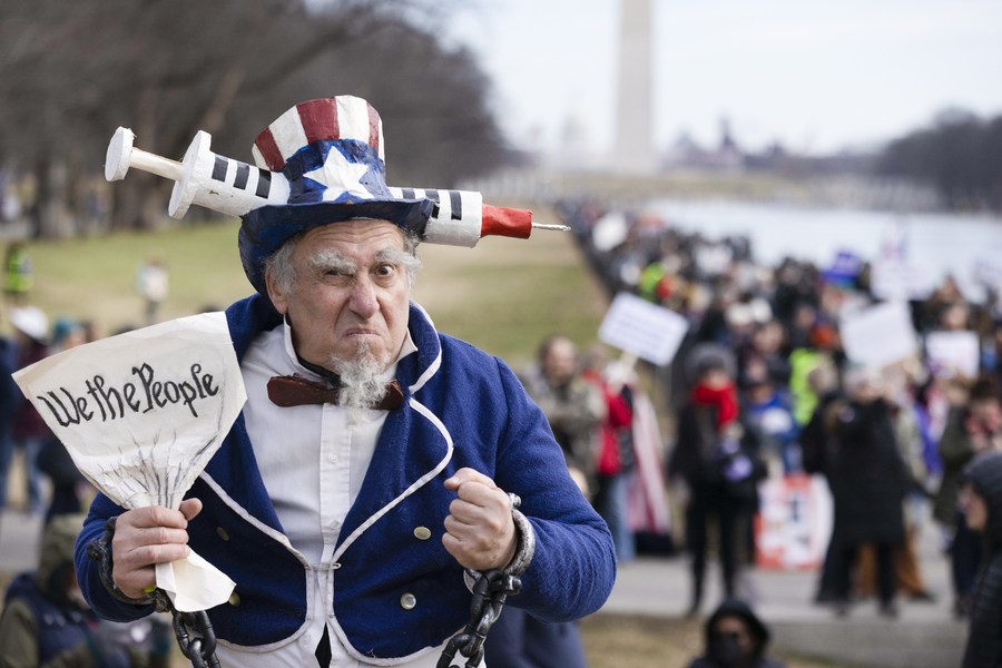 A man poses while attending an event protesting vaccine mandates and other pandemic restrictions in Washington, D.C., the United States, Jan. 23, 2022. (Photo by Aaron Schwartz/Xinhua)