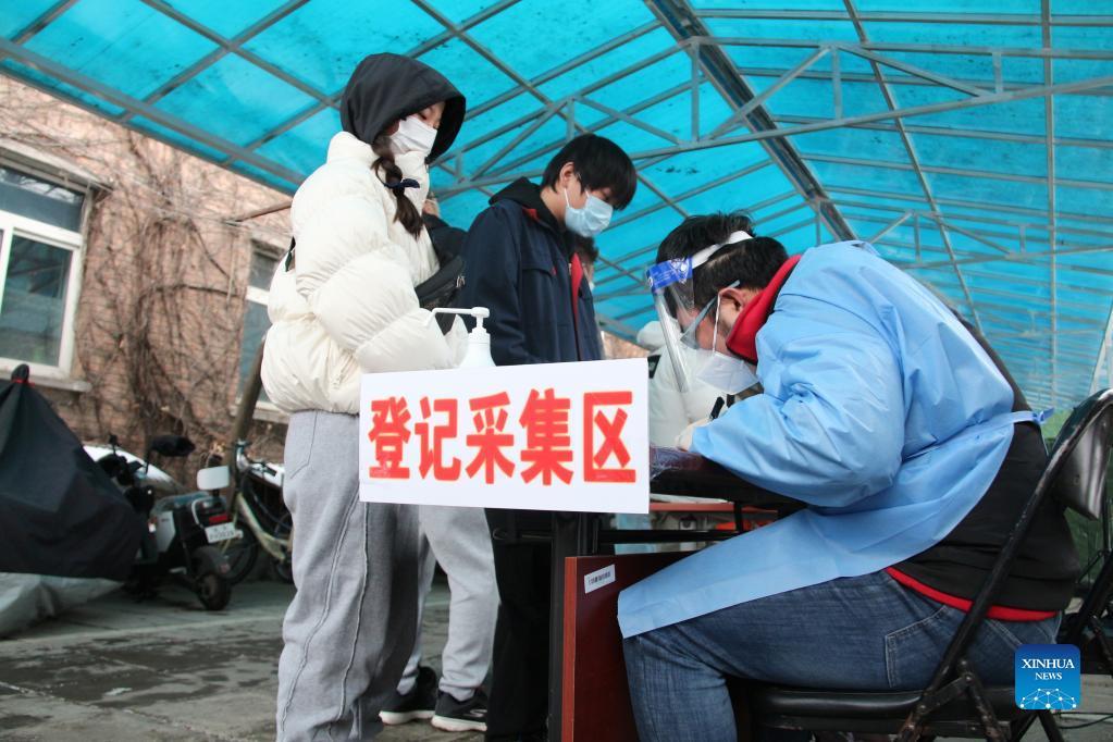 Volunteers register for residents waiting for nucleic acid test at a COVID-19 testing site in Fengtai district in Beijing, Jan 23, 2022. [Photo/Xinhua]