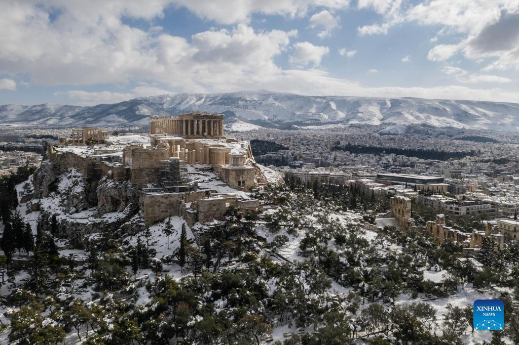 Aerial photo taken on Jan. 25, 2022 shows the Acropolis of Athens covered in snow after heavy snowfall in Athens, Greece. Much of Greece was paralyzed on Tuesday for a second day after heavy snowfall caused hours of travel disruptions and power cuts. (Photo by Lefteris Partsalis/Xinhua)