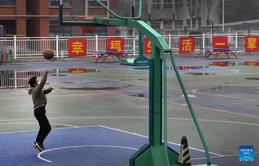A citizen plays basketball at a residential area in Xi'an, northwest China's Shaanxi Province, Jan. 25, 2022. Xi'an cleared all areas classified as high and medium-risk for COVID-19 on Jan. 24. (Xinhua/Tao Ming)