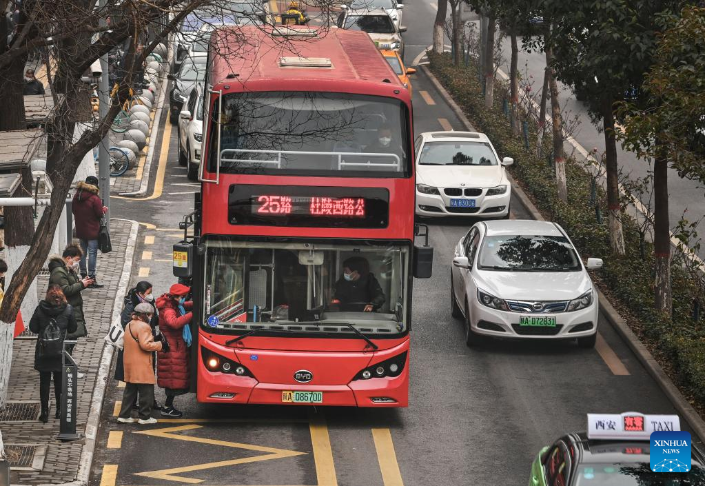 Citizens prepare to get on a bus in Xi'an, northwest China's Shaanxi Province, Jan. 25, 2022. Xi'an cleared all areas classified as high and medium-risk for COVID-19 on Jan. 24. (Xinhua/Tao Ming)