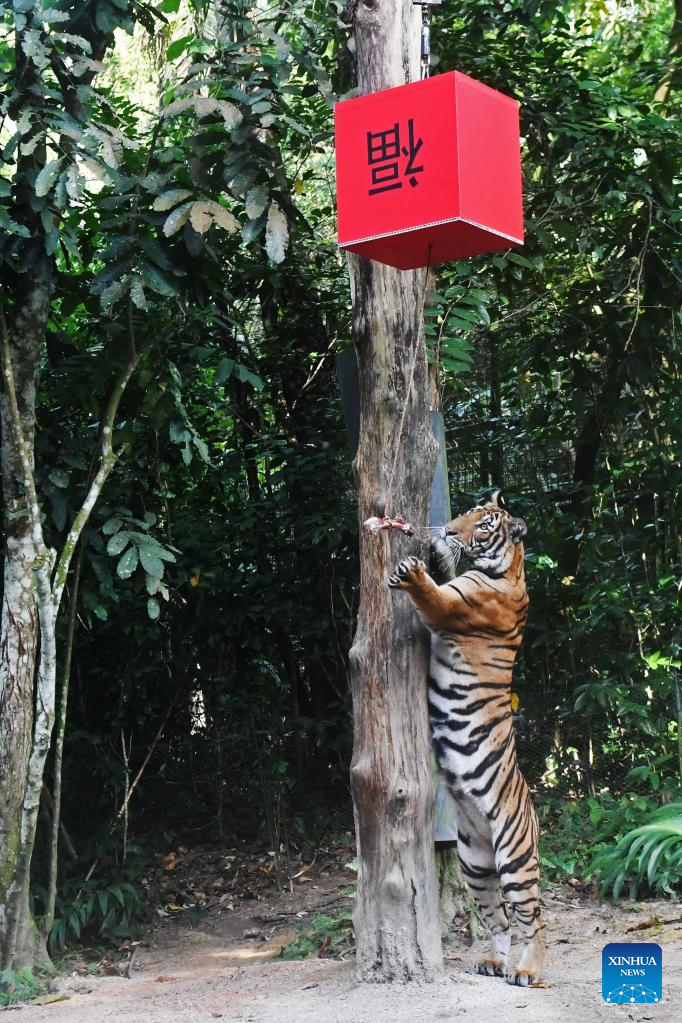 A Malayan tiger attempts to get to the food from a container with Chinese character "Fu" on it, meaning fortune and luck in English, as part of the Chinese Lunar New Year celebrations held in the Singapore Night Safari on Jan. 25, 2022. (Photo by Then Chih Wey/Xinhua)
