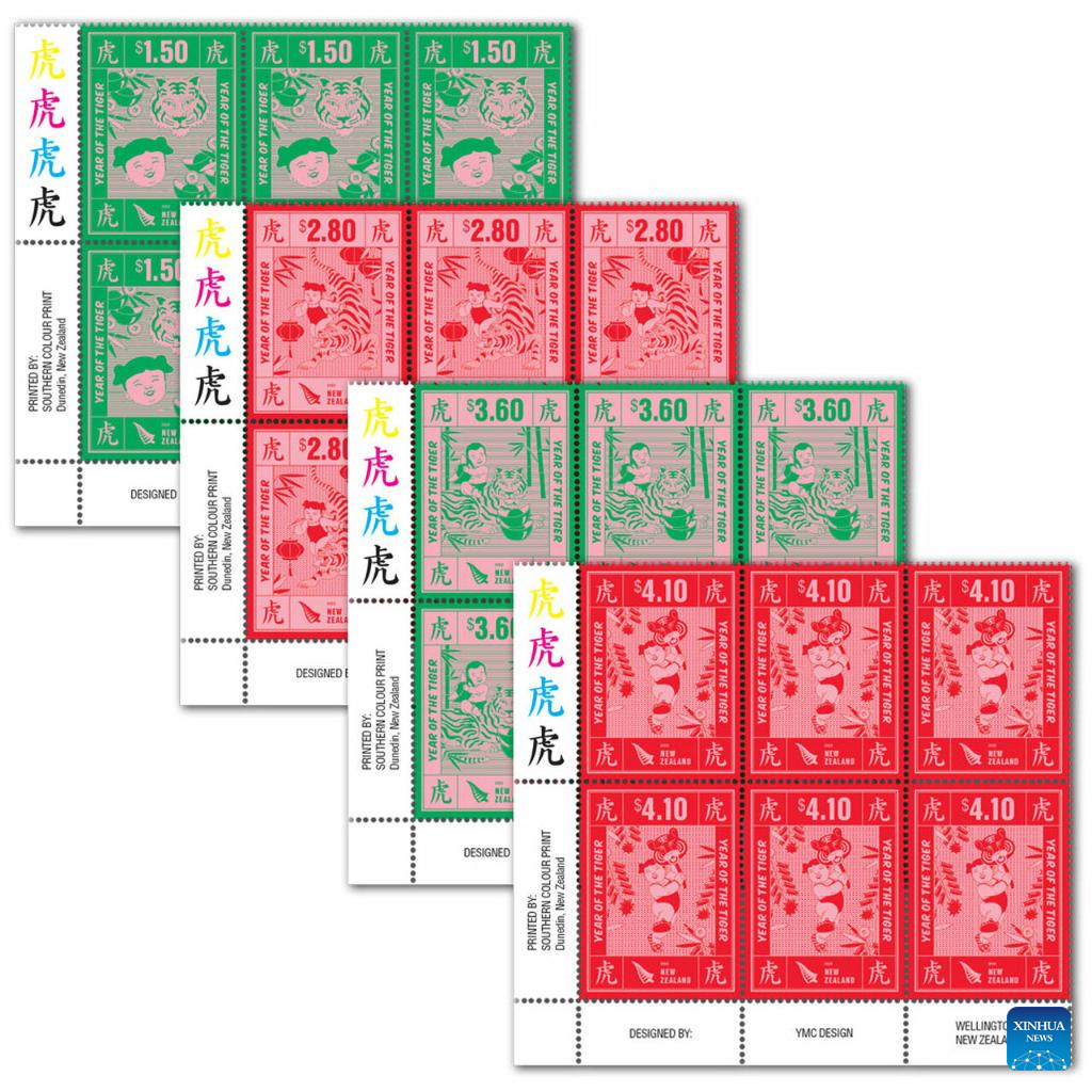 Picture shows the 2022 Year of the Tiger stamps published by New Zealand Post. New Zealand Post has published the 2022 Year of the Tiger stamps to celebrate the upcoming Chinese New Year. It is the 26th consecutive year that New Zealand has published Chinese zodiac stamps. (NZ Post/Handout via Xinhua)