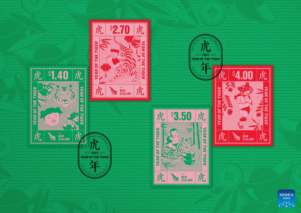 Picture shows the 2022 Year of the Tiger stamps published by New Zealand Post. New Zealand Post has published the 2022 Year of the Tiger stamps to celebrate the upcoming Chinese New Year. It is the 26th consecutive year that New Zealand has published Chinese zodiac stamps. (NZ Post/Handout via Xinhua)