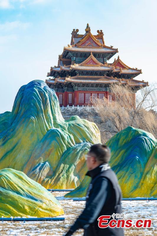 Elements in "A Panorama of Rivers and Mountains," a 12-meter-long landscape painting created in 1096, are installed before Palace Museum in Beijing, capital of China, Jan. 25, 2022. (Photo: China News Service/Hou Yu)