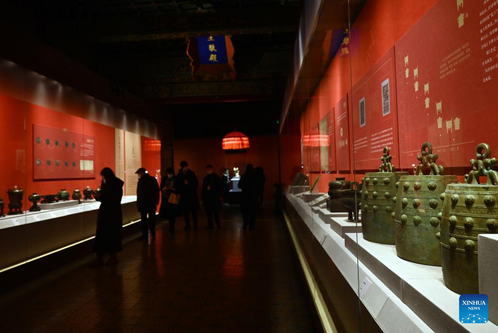 Visitors view exhibits during an exhibition held at the Palace Museum in Beijing, capital of China, Jan. 25, 2022.(Xinhua/Jin Liangkuai)
