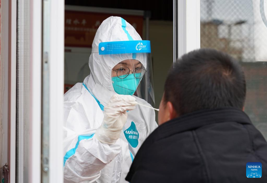 A medical worker takes a swab sample from a resident at a COVID-19 testing site in Xicheng District in Beijing, capital of China, Jan. 26, 2022. (Xinhua/Ren Chao)