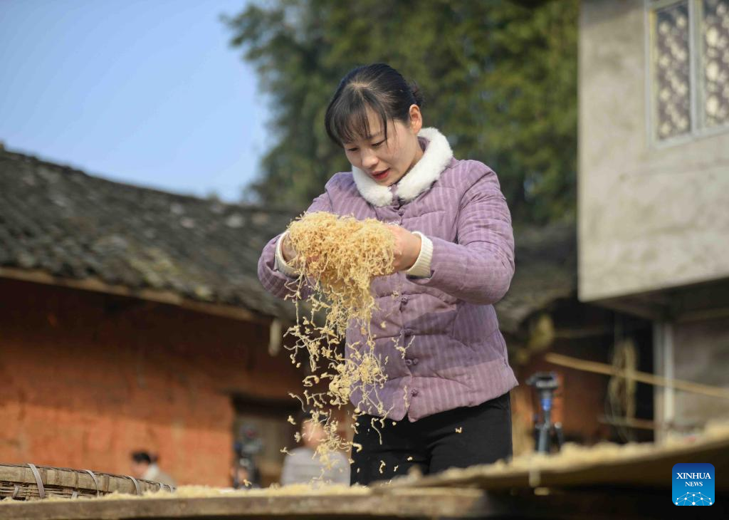 Wu Qiuyue dries radish at a yard in Zhuhai Village of Baijie Town of Naxi District, Luzhou, southwest China's Sichuan Province, Jan. 18, 2022. Years ago, Wu Qiuyue used to work in an electronics factory in south China's Shenzhen. Later, in order to take care of her parents and daughter, she and her husband Huang Zhongping decided to return to her hometown to start a business together. (Xinhua/Liu Kun)
