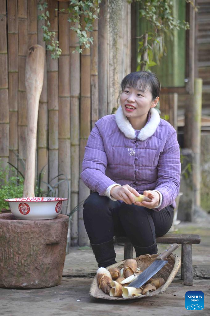 Wu Qiuyue peels winter bamboo shoots at a yard in Zhuhai Village of Baijie Town of Naxi District, Luzhou, southwest China's Sichuan Province, Jan. 18, 2022. Years ago, Wu Qiuyue used to work in an electronics factory in south China's Shenzhen. Later, in order to take care of her parents and daughter, she and her husband Huang Zhongping decided to return to her hometown to start a business together.
