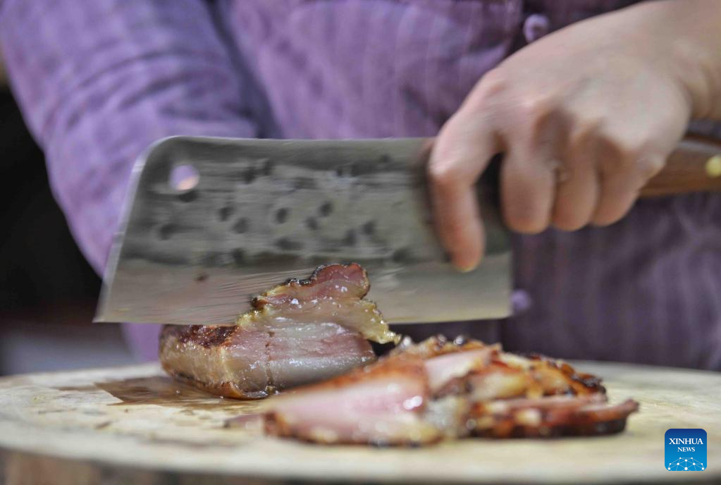 Wu Qiuyue slices cured meat when shooting short videos in Zhuhai Village of Baijie Town of Naxi District, Luzhou, southwest China's Sichuan Province, Jan. 18, 2022. Years ago, Wu Qiuyue used to work in an electronics factory in south China's Shenzhen. Later, in order to take care of her parents and daughter, she and her husband Huang Zhongping decided to return to her hometown to start a business together. (Xinhua/Liu Kun)