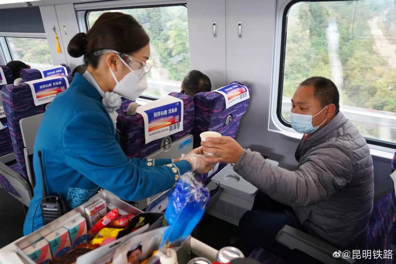 An attendant on a train of the China-Laos Railway serves a cup of water for a passenger. (Photo from the official page of the China Railway Kunming Group on social media platform Weibo)