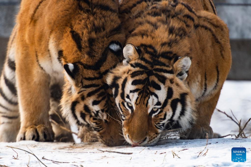 Photo taken on Jan. 25, 2022 shows Siberian tigers eating at the Siberian Tiger Park in northeast China's Heilongjiang Province. (Xinhua/Xie Jianfei)