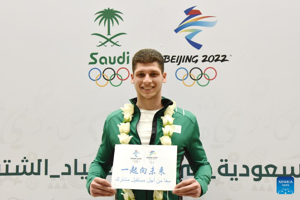 Saudi Alpine skier Fayik Abdi poses with a piece of paper printing "Together for a Shared Future", the official motto for Beijing 2022, after a press conference in Riyadh, Saudi Arabia, Jan. 26, 2022. Saudi Arabia will send a 9-member delegation to Beijing 2022 Olympic Winter Games. (Xinhua/Wang Haizhou)