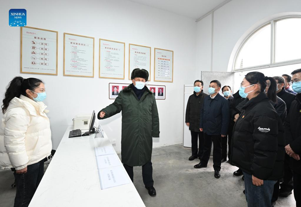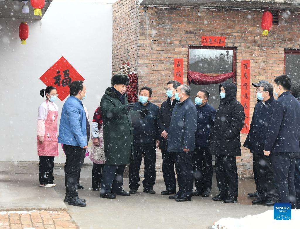Chinese President Xi Jinping, also general secretary of the Communist Party of China (CPC) Central Committee and chairman of the Central Military Commission, inspects local work in consolidating and expanding anti-poverty achievements and advancing rural vitalization in Duancun Village, Sengnian Township of Fenxi County, north China's Shanxi Province, Jan. 26, 2022. Xi on Wednesday began his visit to Shanxi Province ahead of the Spring Festival, or the Chinese New Year. (Xinhua/Li Xueren)