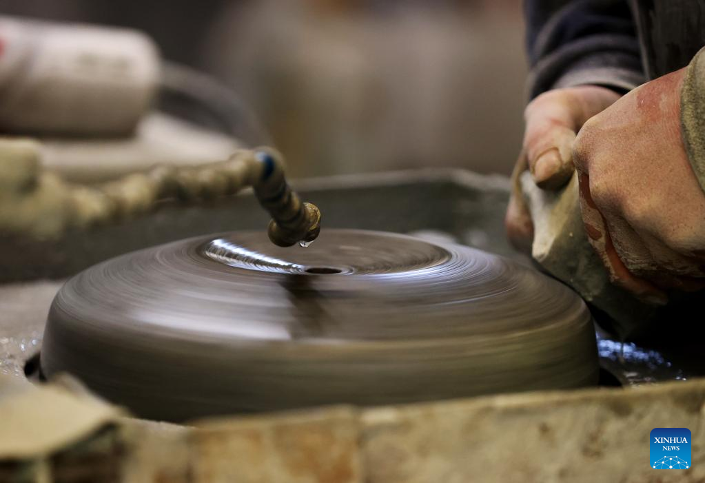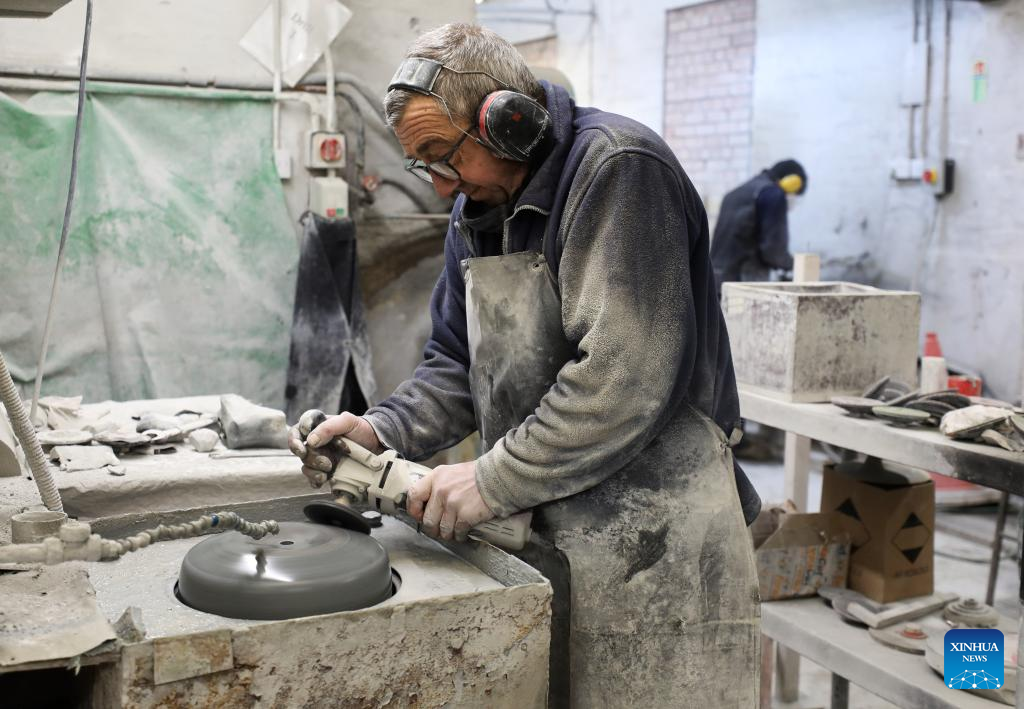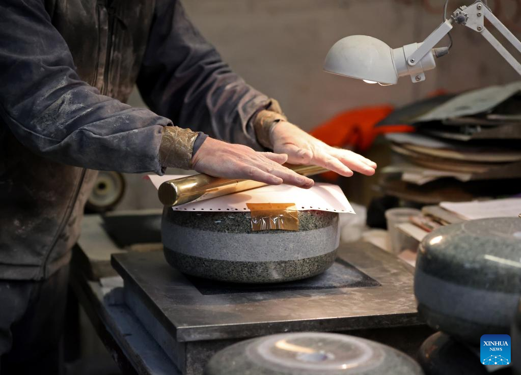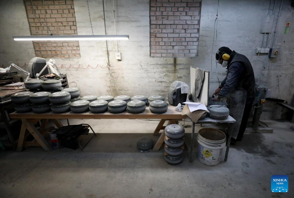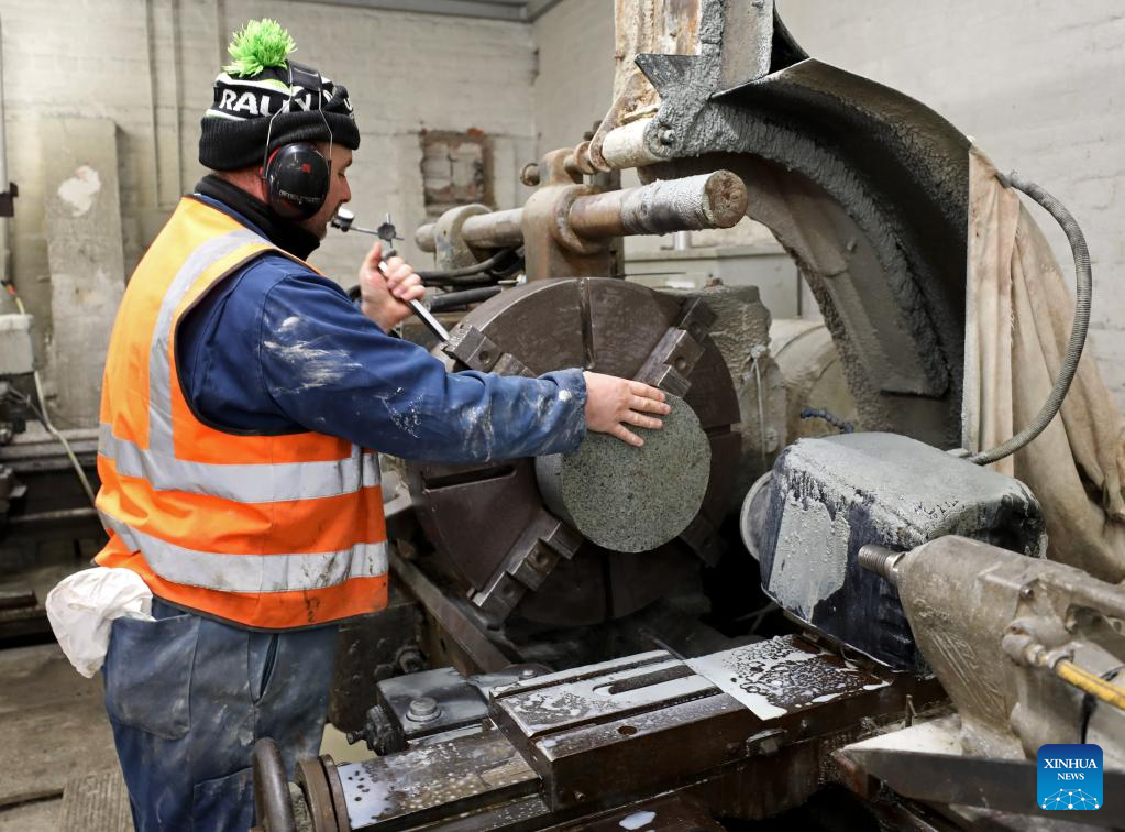 A man works in Kays Curling factory in Mauchline, Scotland, Britain, Jan. 24, 2022. Every single Olympic curling stone is made of granite from a little island off the west coast of Scotland, called Ailsa Craig. The Ailsa Craig granite is some of the hardest found in the world and maintains its shape despite grinding and wet conditions, making it perfect material for curling stone. All curling stones used at Olympic events are manufactured by Kays Curling in Mauchline, Scotland, Britain. (Xinhua/Li Ying)