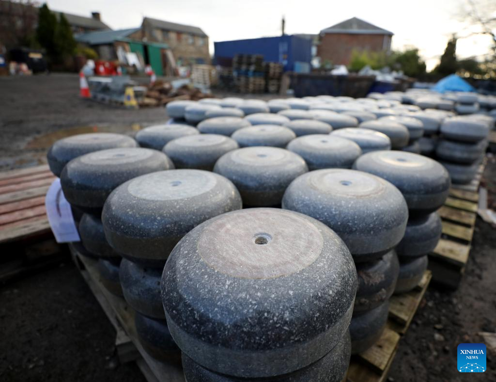 Curling stones are seen outside of Kays Curling factory in Mauchline, Scotland, Britain, Jan. 24, 2022. Every single Olympic curling stone is made of granite from a little island off the west coast of Scotland, called Ailsa Craig. The Ailsa Craig granite is some of the hardest found in the world and maintains its shape despite grinding and wet conditions, making it perfect material for curling stone. All curling stones used at Olympic events are manufactured by Kays Curling in Mauchline, Scotland, Britain. (Xinhua/Li Ying)