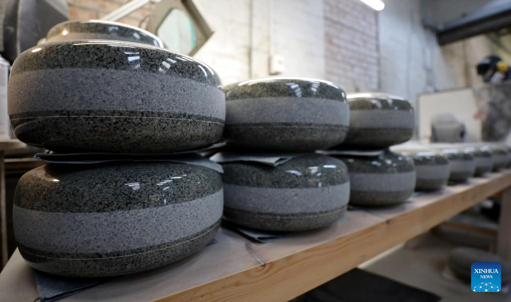 Curling stones are seen in Kays Curling factory in Mauchline, Scotland, Britain, Jan. 24, 2022. Every single Olympic curling stone is made of granite from a little island off the west coast of Scotland, called Ailsa Craig. The Ailsa Craig granite is some of the hardest found in the world and maintains its shape despite grinding and wet conditions, making it perfect material for curling stone. All curling stones used at Olympic events are manufactured by Kays Curling in Mauchline, Scotland, Britain. (Xinhua/Li Ying)