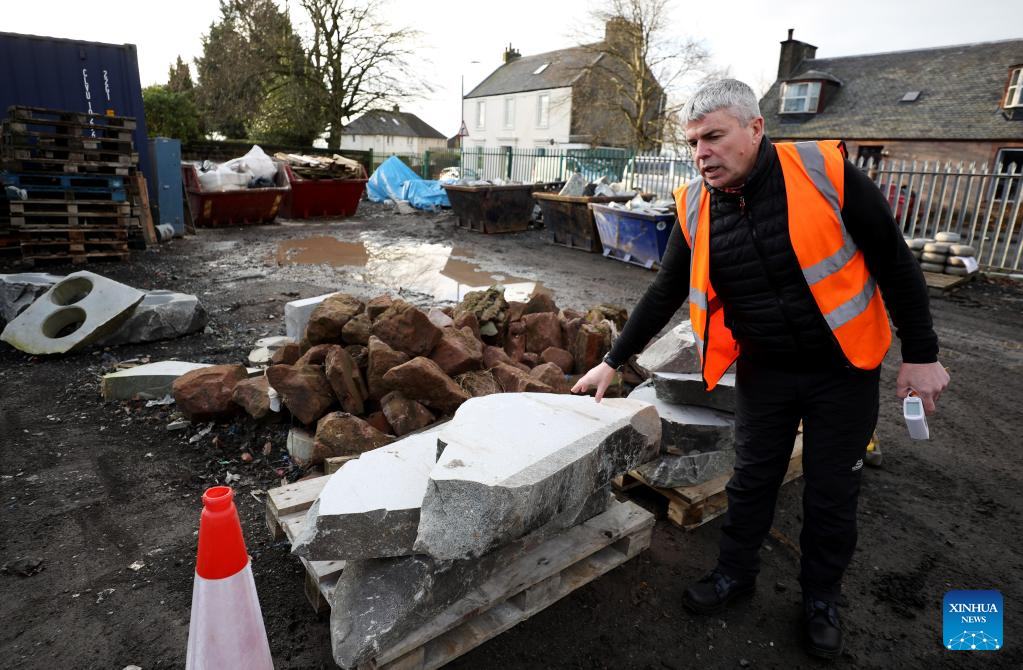A man deals with stones which have been cut from a piece of Ailsa Craig granite in Kays Curling factory in Mauchline, Scotland, Britain, Jan. 24, 2022. Every single Olympic curling stone is made of granite from a little island off the west coast of Scotland, called Ailsa Craig. The Ailsa Craig granite is some of the hardest found in the world and maintains its shape despite grinding and wet conditions, making it perfect material for curling stone. All curling stones used at Olympic events are manufactured by Kays Curling in Mauchline, Scotland, Britain. (Xinhua/Li Ying)