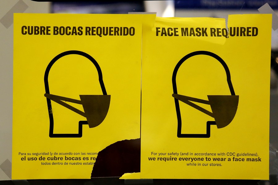 Signs announcing the indoor mask mandate are seen in New Orleans, Louisiana, the United States, Jan. 11, 2022. (Photo by Lan Wei/Xinhua)