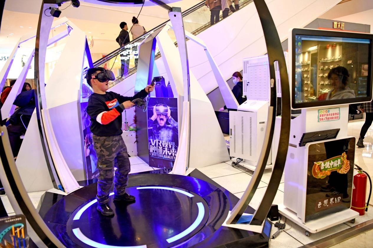 A child tries virtual reality (VR) devices at a mall in Huainan city, east China’s Anhui province, Feb. 14, 2021. (People’s Daily Online/ Chen Bin)