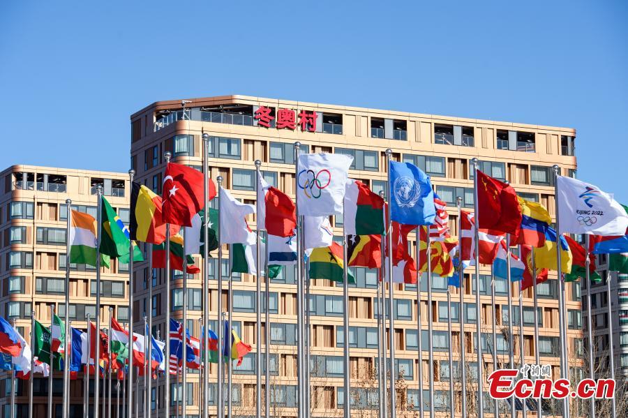 Flags fly at the square of the Olympic Villages for the Beijing 2022 Olympic Winter Games in Beijing, capital of China, Jan. 27, 2022. (Photo: China News Service/He Penglei)