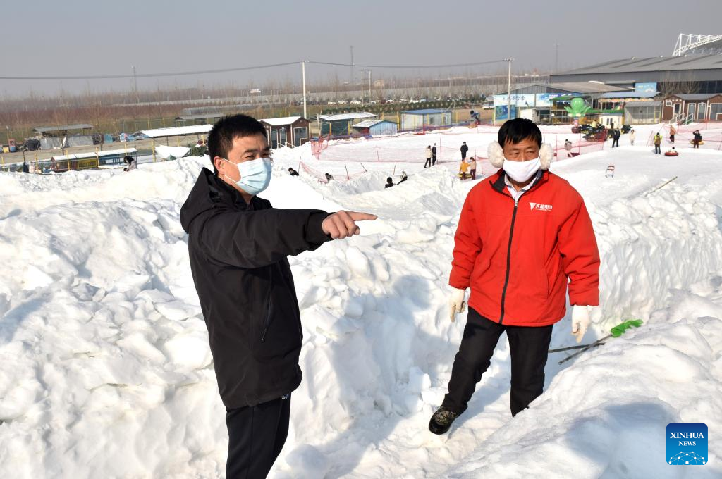 Yang Xubo (L) talks to a staff member at a ski resort in Xingtai, north China's Hebei Province, Jan. 27, 2022. Yang Xubo is a winter sports enthusiast in Xingtai. In 2018, he started a ski resort business. Yang believes that his 40000-square-meter ski resort will help promote winter sports among people. (Xinhua/Zhu Xudong)