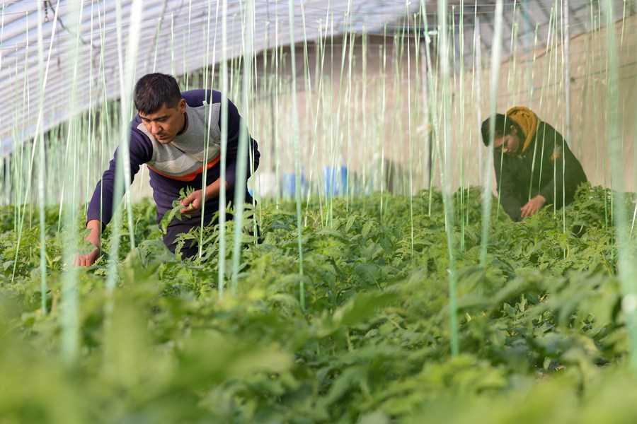 Villagers work at a greenhouse in an industrial park in Shache County of Kashgar, northwest China's Xinjiang Uygur Autonomous Region, Dec. 12, 2021. (Xinhua/Ding Lei)
