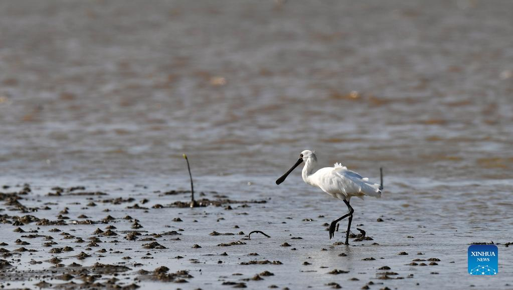 A black-faced spoonbill forages at a wetland park in south China's Hainan Province, Jan. 27, 2022. (Xinhua/Yang Guanyu)