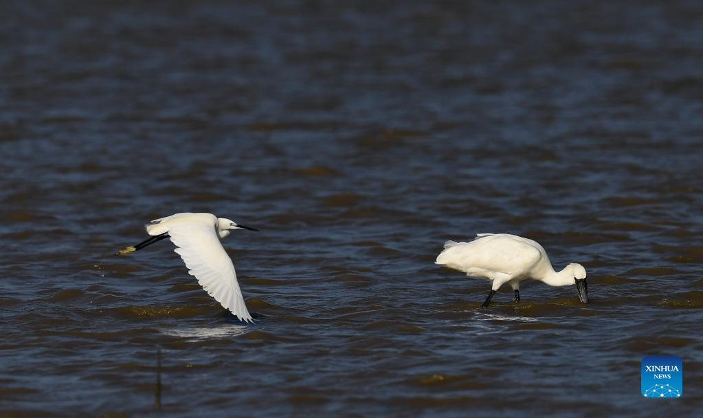 A flock of black-faced spoonbills and other birds are seen at a wetland park in south China's Hainan Province, Jan. 27, 2022. (Xinhua/Yang Guanyu)