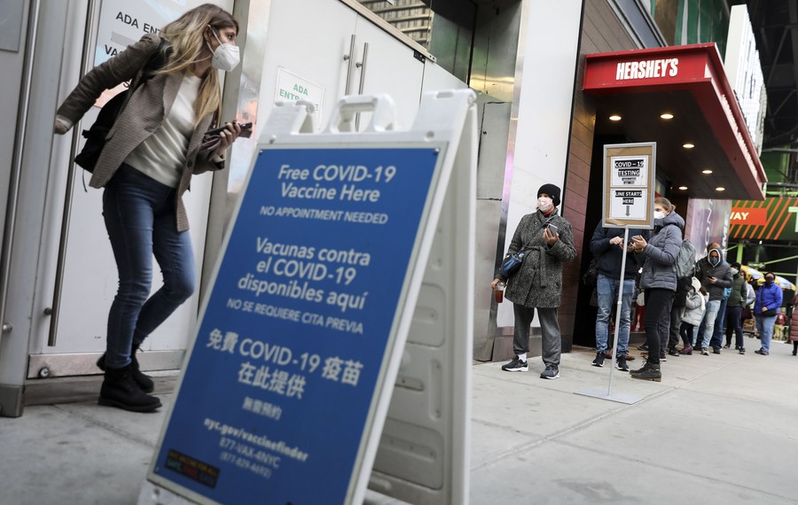 People line up to enter a COVID-19 test and vaccination site near Times Square in New York, the United States, Dec. 7, 2021. (Xinhua/Wang Ying)
