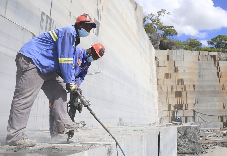 Workers use a drilling machine to cut a granite rock at Jinding mine in Mutoko, Mashonaland East Province, Zimbabwe, on Jan. 20, 2022. (Photo by Shaun Jusa/Xinhua)