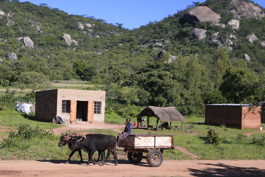A boy on an ox-drawn cart passes a granite mountain in Mutoko, Mashonaland East Province, Zimbabwe, on Jan. 21, 2022. (Photo by Shaun Jusa/Xinhua)