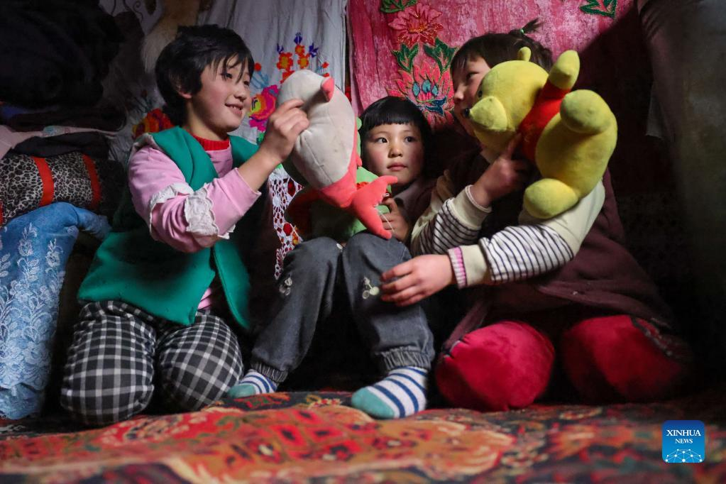 Children play at home in Akyaz Valley in Zhaosu County, Kazak Autonomous Prefecture of Ili, northwest China's Xinjiang Uygur Autonomous Region, Jan. 24, 2022. Akyaz Valley is an important winter pasture for herdsmen in Zhaosu. Every year, herdsmen would migrate along the Akyaz River, driving over 500,000 cattle with them to settle in the valley for the winter. With an average altitude of 3,000 meters, the Akyaz Valley has abundant grass, water and a warmer climate, thanks to the surrounding mountains which block the cold winds. In recent years, while protecting the nomadic tradition, the local government has tried to improve the living conditions in the valley by upgrading the roads, building new communication facilities, installing photovoltaic generators for herdsmen's houses, and constructing animal husbandry hospitals. (Xinhua/Ding Lei)
